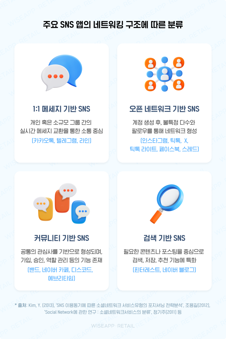 출처에 따르면, SNS는 커뮤니케이션 및 네트워킹 구조에 따라 크게 4가지로 분류할 수 있어요.