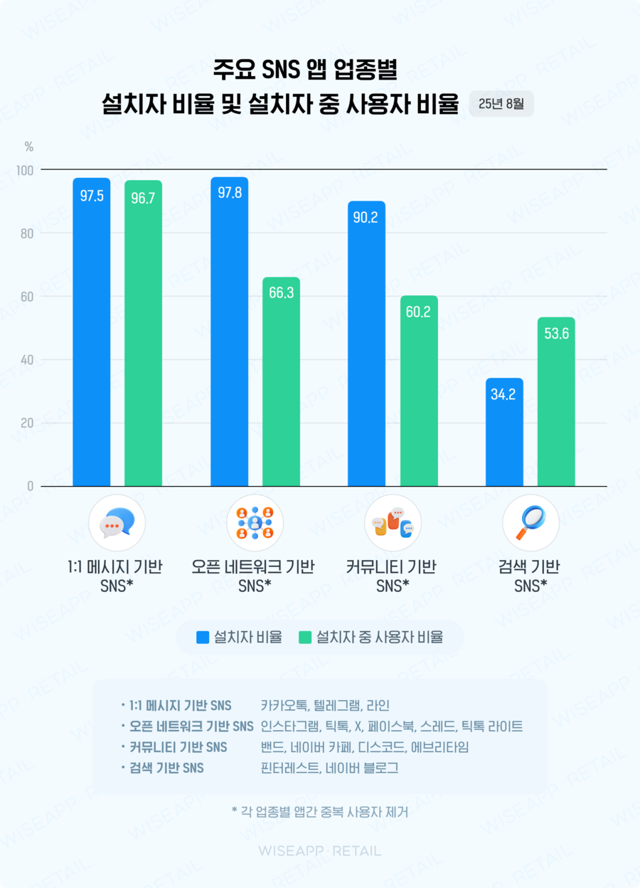 ✅ 1:1 메시지 기반, 오픈 네트워크 기반, 커뮤니티 기반 SNS 앱의 설치율은 90% 이상