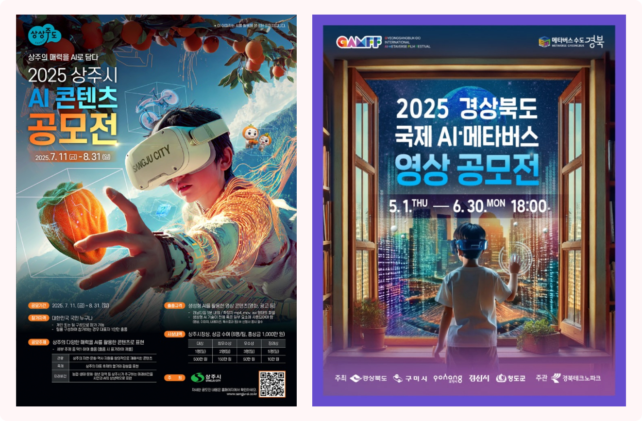 출처 : 2025 상주시 AI 콘텐츠 공모전, 2025 경상북도 국제 AI·메타버스 영상 공모전 포스터
