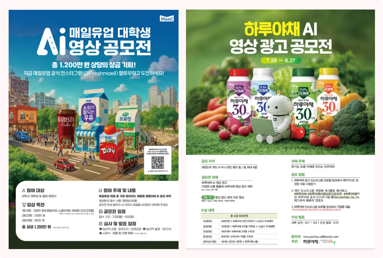 2025년에 7월에 개최된 매일유업 대학생 AI 영상 공모전과 하루야채 AI 영상 광고 공모전은 모두 AI로 영상을 제작하는 것 뿐만 아니라 1등에게는 인턴 경험 및 입사 우대 혜택을 주었다는 것에 공통점이 있어요. 두 기업 모두 참가자 중 AI를 잘 활용하는 사람을 발굴하여 마케팅 인재로 채용하고자 했습니다.