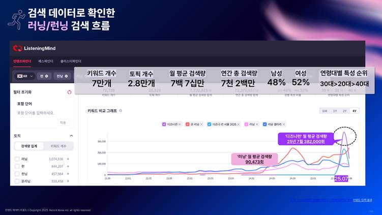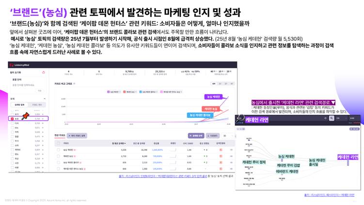 리스닝마인드는 검색 데이터 기반으로 이러한 소비자 인텐트(intent)의 맥락을 구조적으로 분석해, 브랜드 전략·상품 기획·마케팅 커뮤니케이션에 실질적 인사이트를 제공한다.