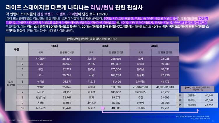 - 20대: 나이트런, 빵빵런 등 이벤트형 키워드 중심 — 브랜드/이벤트 참여와 경험의 러닝으로 ‘입문’한 세대