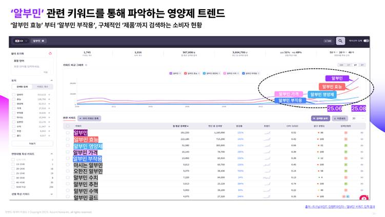 2025년 상반기 이후, 실버세대 건강 키워드 중 가장 두드러진 상승세를 보인 것은 **‘알부민’**이었다. ‘알부민’ 관련 키워드의 월평균 검색량은 18만 회 이상으로, ‘효능’과 ‘영양제’ 키워드가 상위를 차지했다.