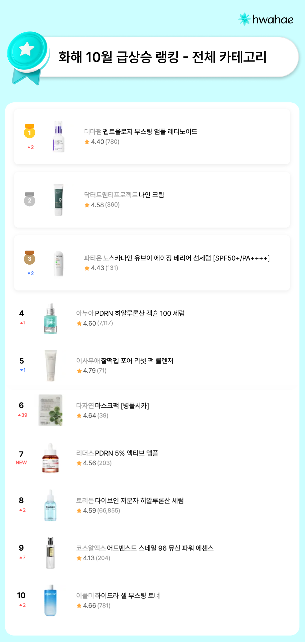 - 트렌드를 빠르게 읽는 마케터는 다르게 움직입니다. 10월의 소비자 니즈는 '보습 루틴의 정교화'와 '저자극 안티에이징'으로 옮겨가고 있어요! 사용자 리뷰와 실시간 데이터 기반 랭킹을 통해 포착한 트렌드를 소개합니다!
