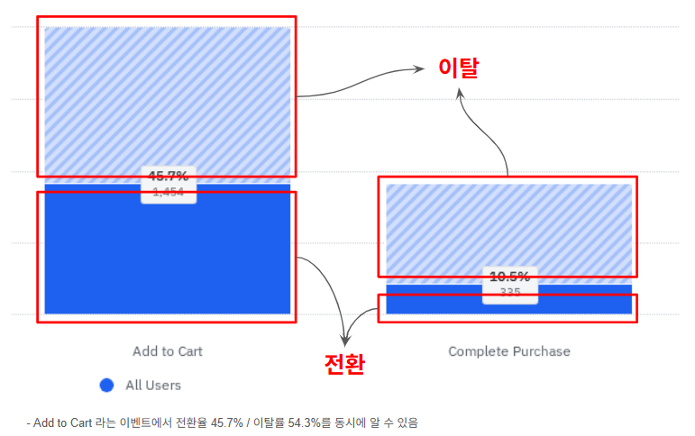 퍼널 그래프를 자세히 보면, 연한 파란색은 이탈을 의미하고, 진한 파란색은 전환을 의미합니다.