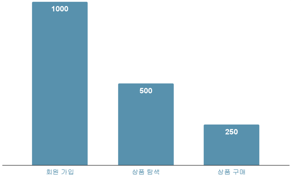 예를 들어, 쇼핑몰에서 가입자 1,000명 중 절반이 첫 세션에서 이탈한다면 퍼널 분석은 아래와 같이 나타납니다.