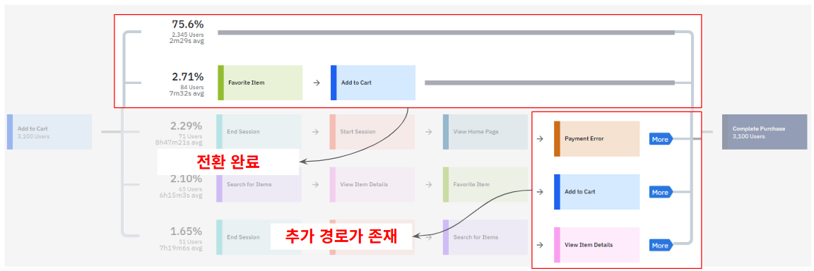 파란색 More 태그를 클릭하면 더 깊은 경로(추가 경로)를 확인할 수 있으며, More 태그가 없다면 현재 경로에서 전환이 완료 되었다는 의미입니다. 따라서 Add to Cart 이벤트에서 Purchase 이벤트까지 경로 중, Add to Cart에서 Purchase까지 곧바로 진행한 사용자가 75.6% 라는 것을 확인할 수 있고, 그 외 경로들은 다른 행동(이벤트) 이후에 Purchase까지 도착했음을 알 수 있습니다.