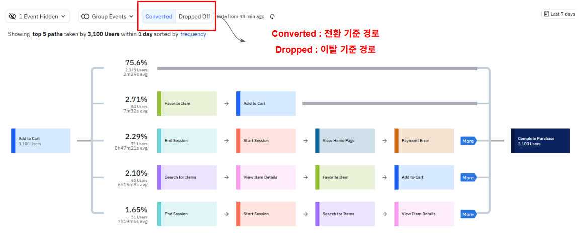 Amplitude의 퍼널 차트는 전환과 이탈을 한 번에 볼 수 있다는 것이 큰 특징인데요.