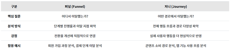 퍼널(Funnel)은 단계별 전환/이탈을 수치로 볼 수 있고, 저니(Journey)는 실제 사용자의 행동 경로를 볼 수 있는 아주 중요한 분석 도구입니다!