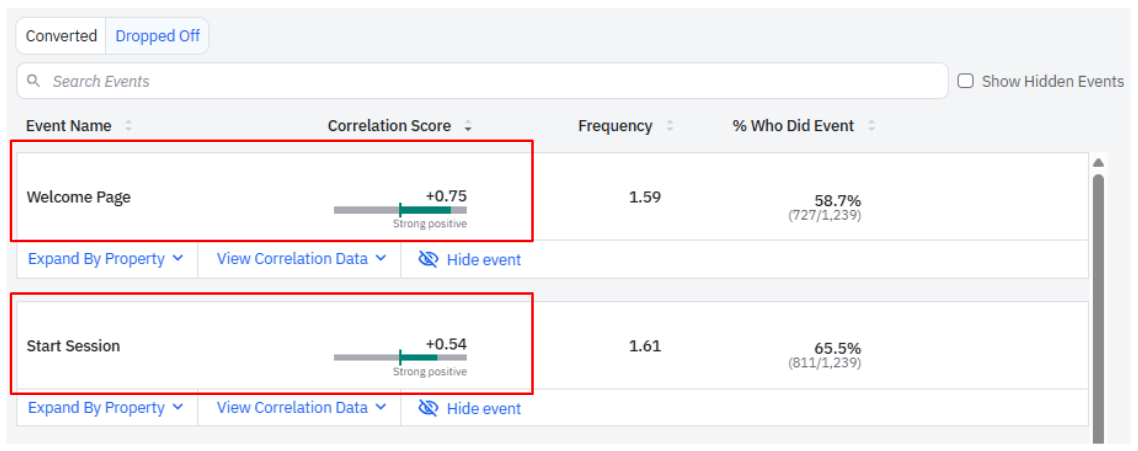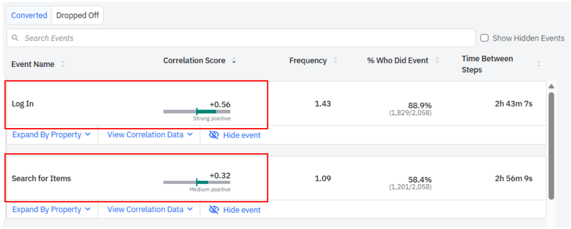 Amplitude의 퍼널 분석에서는 Conversion Driver 기능이 있고, 이는 이벤트 간의 상관관계 분석 결과를 볼 수 있는 가능이 있습니다.