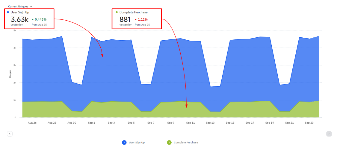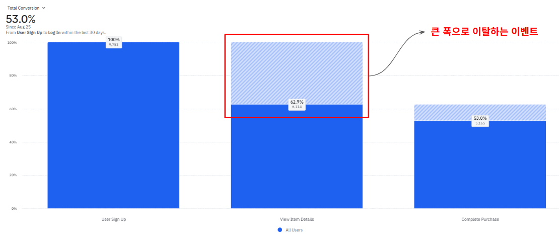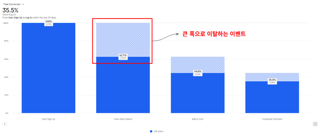 신규 회원 가입자(User Sign Up) 대비 구매 전환(Complete Purchase)이 낮은 상태를 세그먼트 차트를 통해 확인했습니다.