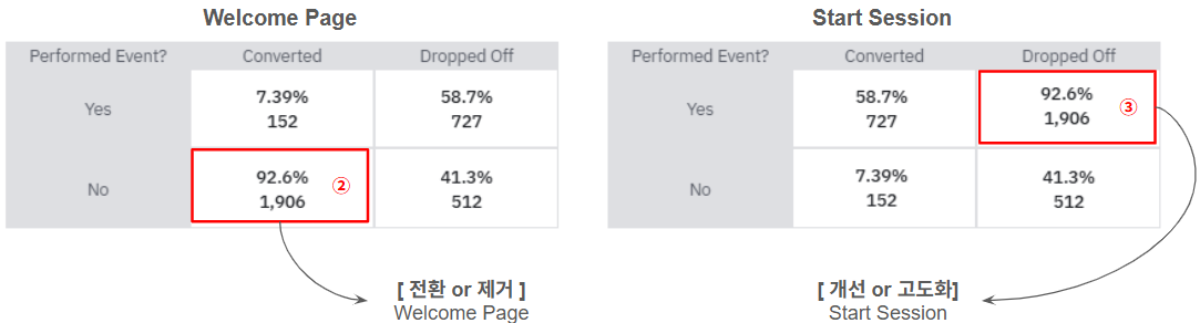 더 자세한 내용은 이탈의 영향력이 큰 Welcome Page와 Start Session 내용으로 설명 드리겠습니다.