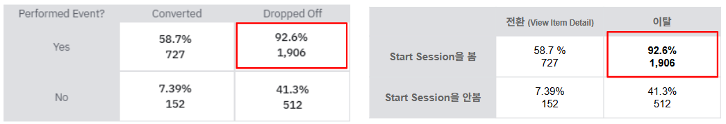 ⇒ 회원가입 이후 Start Session도 전환을 돕는 요인이 아니라, 오히려 이탈과 직결되는 이벤트로 보임