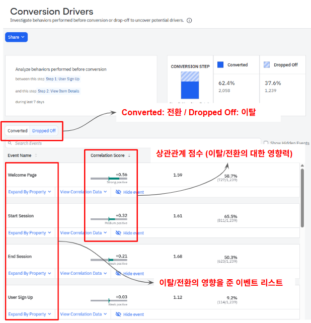 이번에는 전환에 영향을 준 이벤트를 이야기 해보겠습니다. Correlation Score는 이탈의 내용과 마찬가지며,