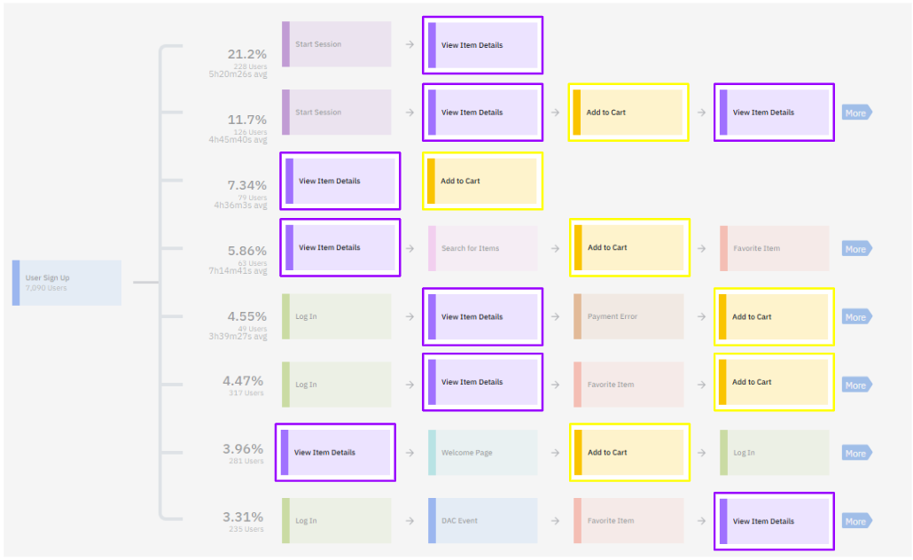 ⇒ 회원 가입 후 View Item Detail (보라) 이벤트로 이어지는 경우가 반복됨을 확인