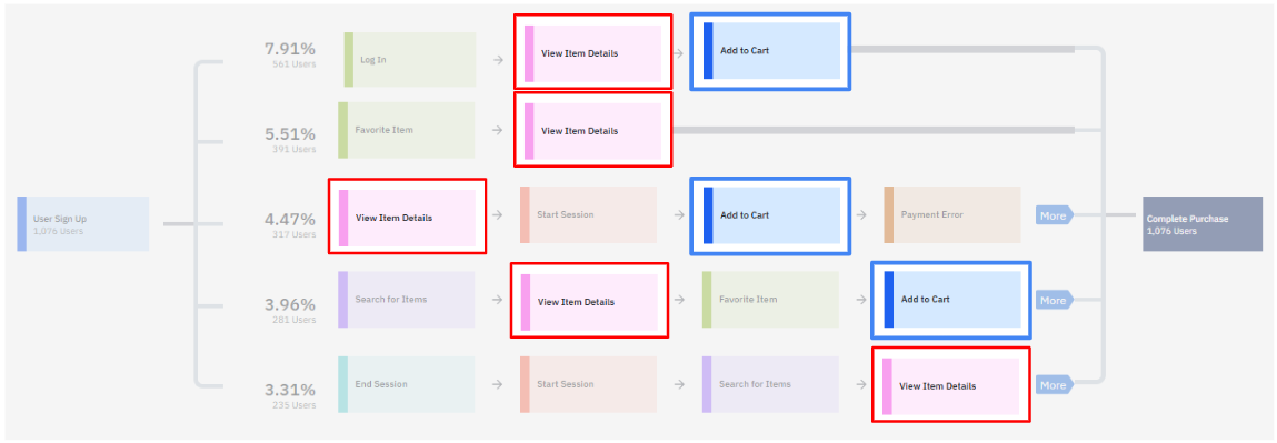 ⇒ View Item Detail (빨강) 이벤트 이후 Add to Cart (파랑)로 이어지는 공통적인 경로 확인