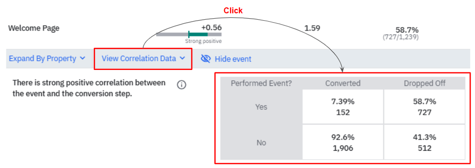 퍼널의 Conversion Driver 기능으로 상관관계를 분석하여 상세한 이탈 원인을 확인