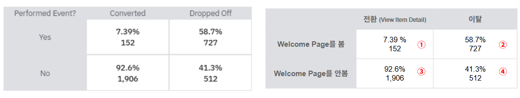 “사용자가 어떤 이벤트(행동)를 한 사람과 안 한 사람 중 누가 전환 또는 이탈을 더 잘했는지 비교하는 표”라고 이해하시면 될 것 같습니다.