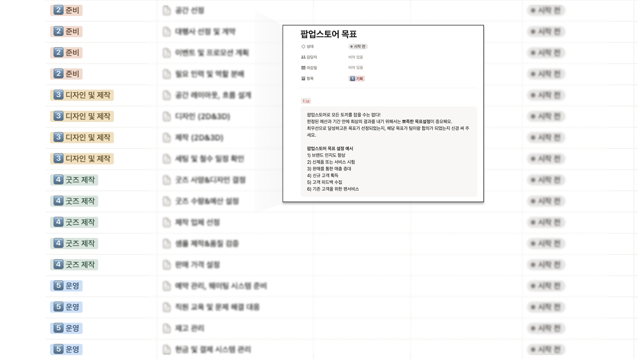 ✔️ 굿즈 제작 단계: 브랜드를 대표할 굿즈를 선정하고, 생산 일정과 수량을 미리 확보해야 해요. 오픈 직전 납품 지연이 가장 흔한 리스크예요.