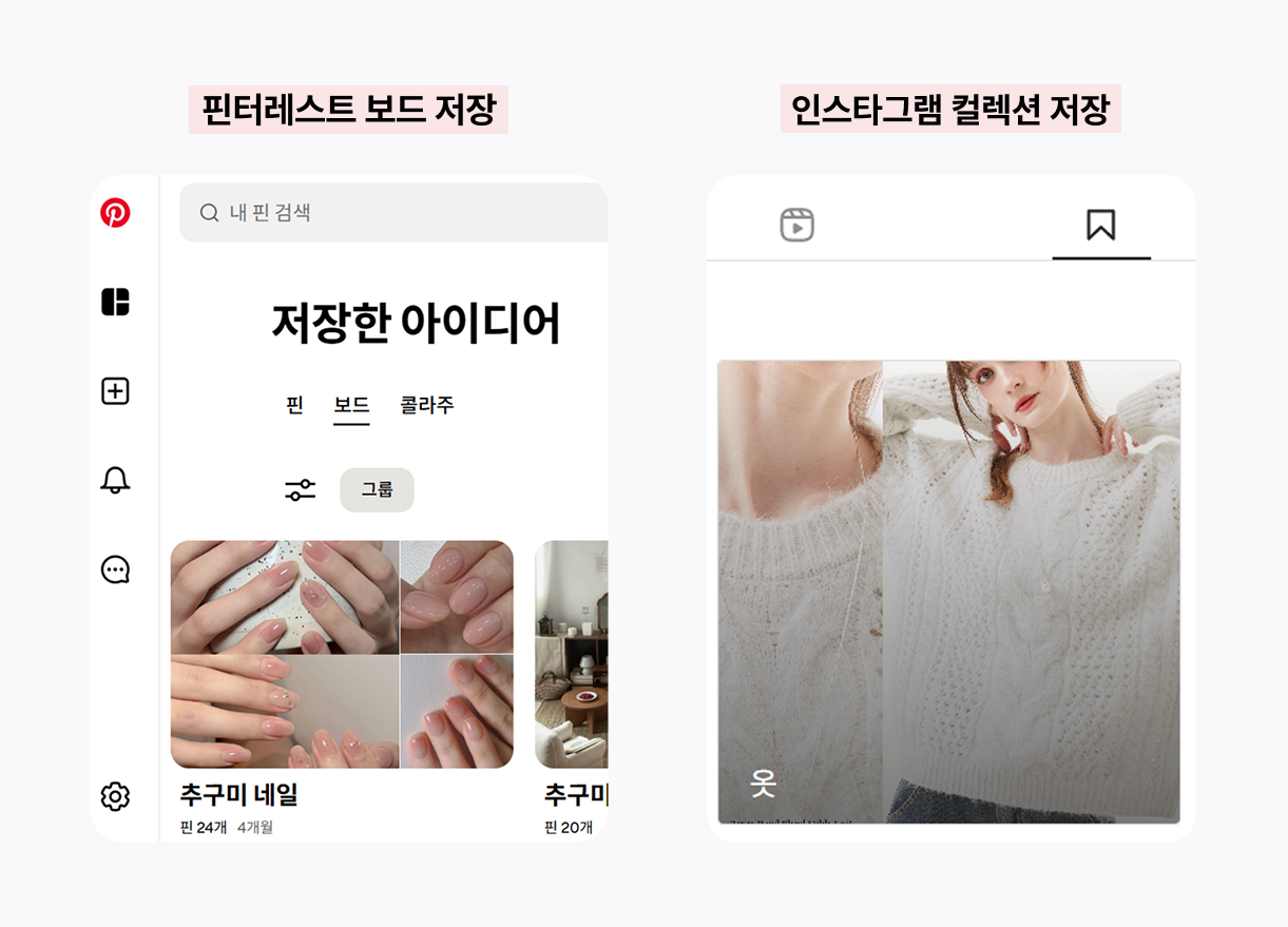 “나의 여름 아카이브”, “요즘 꽂힌 향수 폴더”처럼 사용자가 직접 폴더를 꾸미고 공유할 수 있다면, 그 자체가 하나의 콘텐츠로 활용되죠. 핀터레스트의 보드나 인스타그램 컬렉션처럼 공유형 폴더 UX는 자연스럽게 브랜드 확산의 통로가 돼요. 폴더소비가 가지는 특징을 잘 활용하기 위해선 폴더로 형성한 콘텐츠를 공유할 수 있는 장을 만드는 것이 좋습니다.