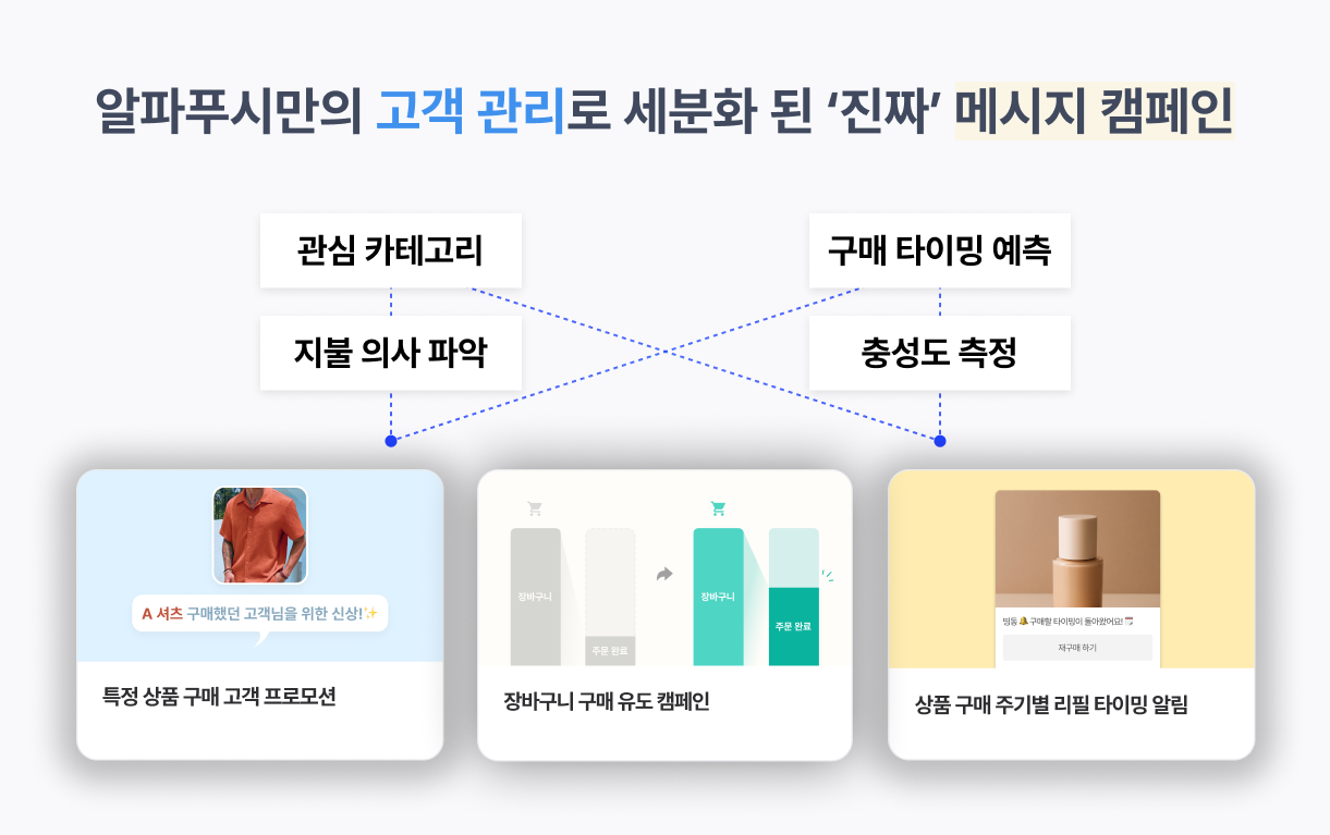 자사몰 CRM 솔루션 알파푸시에는 다양한 상황에 맞춰 보낼 수 있는 메시지 캠페인 프리셋이 준비되어 있는데요. 상품 구매 이력 기반으로 고객에게 메시지를 발송할 수 있는 ‘상품 구매 주기별 타이밍 알림’ 프리셋이이 추가되었습니다. 복잡한 세팅 없이도 적합한 메시지를, 적합한 시점에 자동으로 발송할 수 있죠.