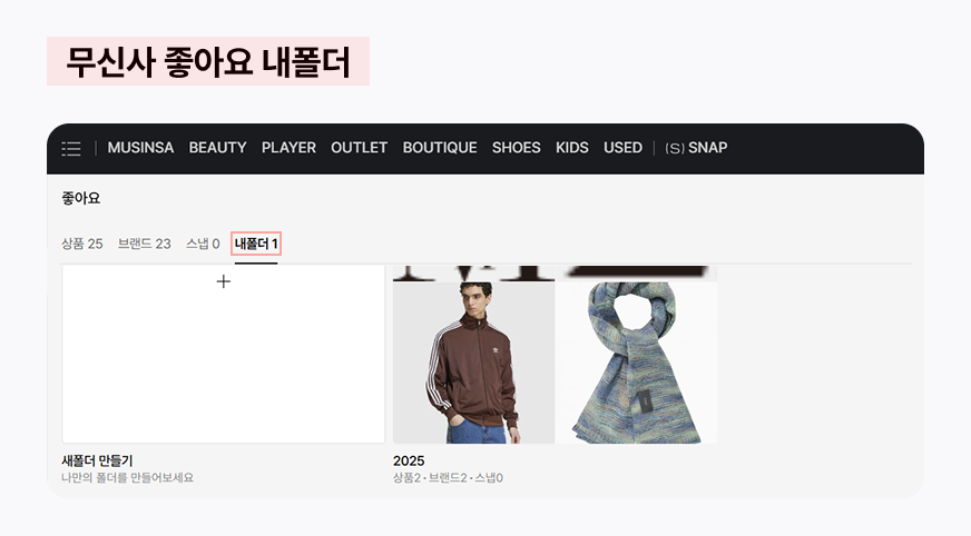 고객의 폴더는 저장 공간을 넘어 취향을 전시하는 공간으로 변하고 있습니다. 가장 대표적으로 무신사는 좋아요 카테고리를 상품, 브랜드, 스냅, 내폴더 무려 4가지로 구분해서 나만의 큐레이션을 만들 수 있게 해요.