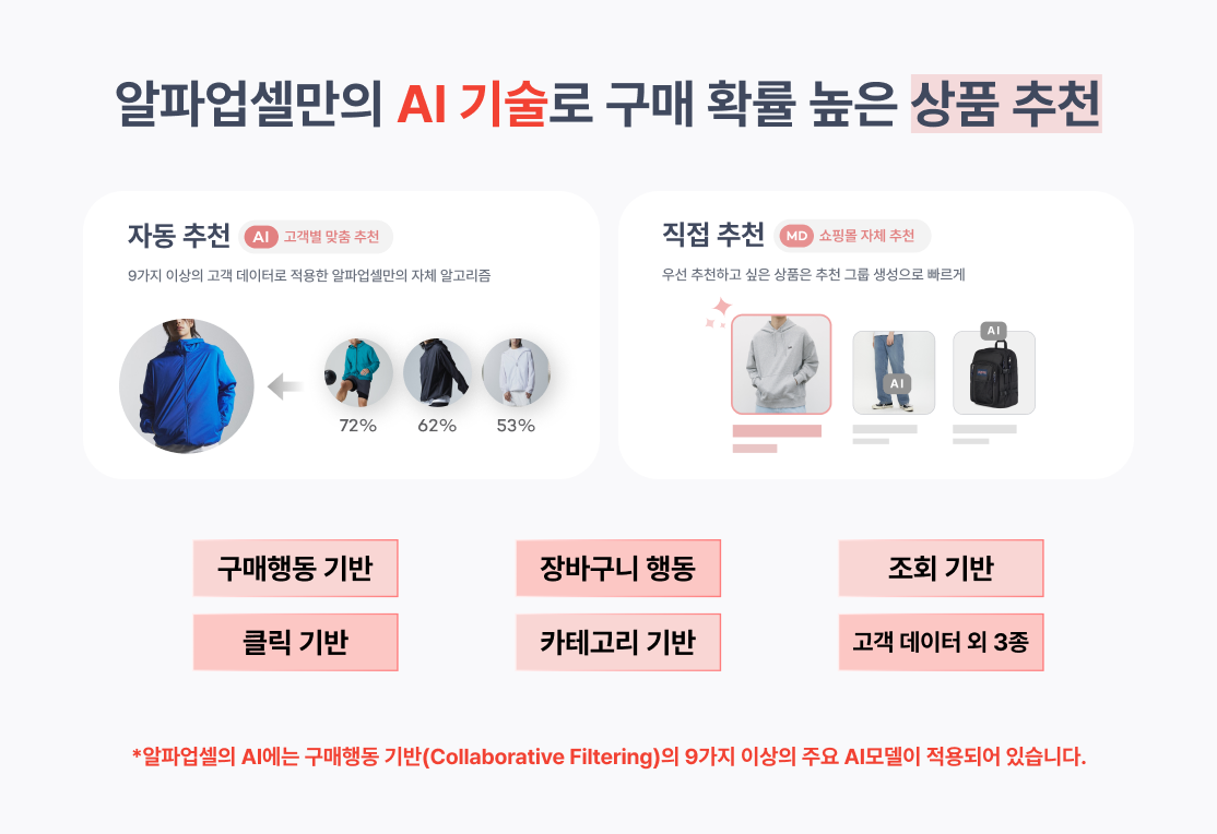폴더 데이터는 고객이 어떤 상품을 함께 담았는지, 어떤 조합을 선호하는지가 가장 생생하게 드러나는 행동 데이터예요. 이 데이터를 활용해 상품을 추천한다면 고객이 그 상품까지 장바구니에 담을 확률이 올라가겠죠. 알파업셀의 상품추천은 구매행동은 물론 장바구니 행동을 기반으로 하는 AI모델을 사용해요.