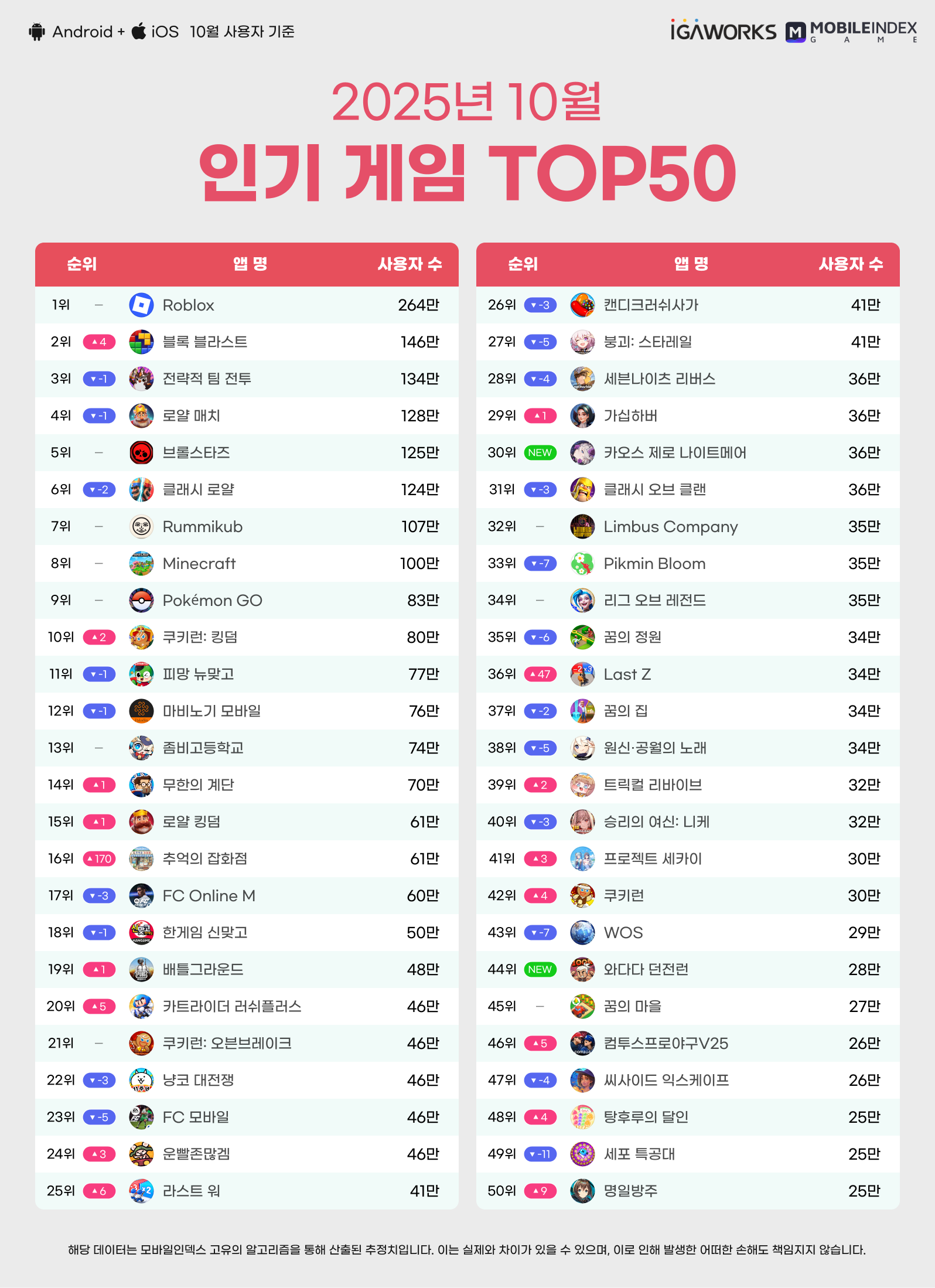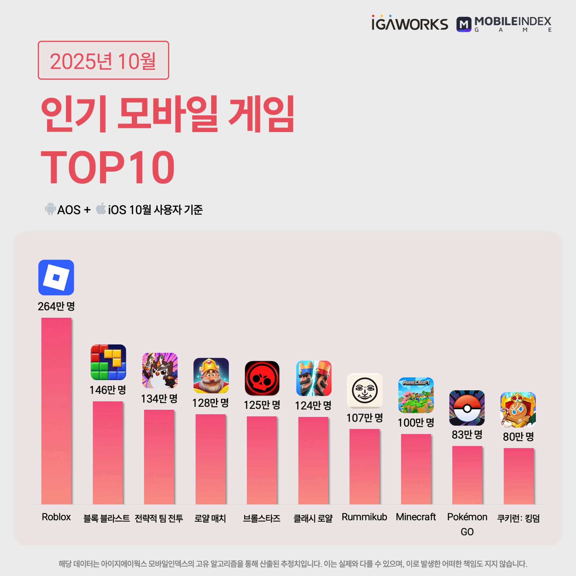 25년 10월, 인기 모바일 게임 1위는 264만 명을 기록한 ‘Roblox’가 차지했습니다. 국내 UGC 크리에이터 활동이 활발해지며 다양한 이용자 제작 경험이 쏟아지고, 교육·커뮤니티 중심 콘텐츠가 확대되면서 꾸준히 신규 유입을 견인한 것이 주효했습니다. 이러한 사용자 중심 생태계를 바탕으로 압도적인 사용량을 유지하며 선두 자리를 굳건히 지키고 있습니다.