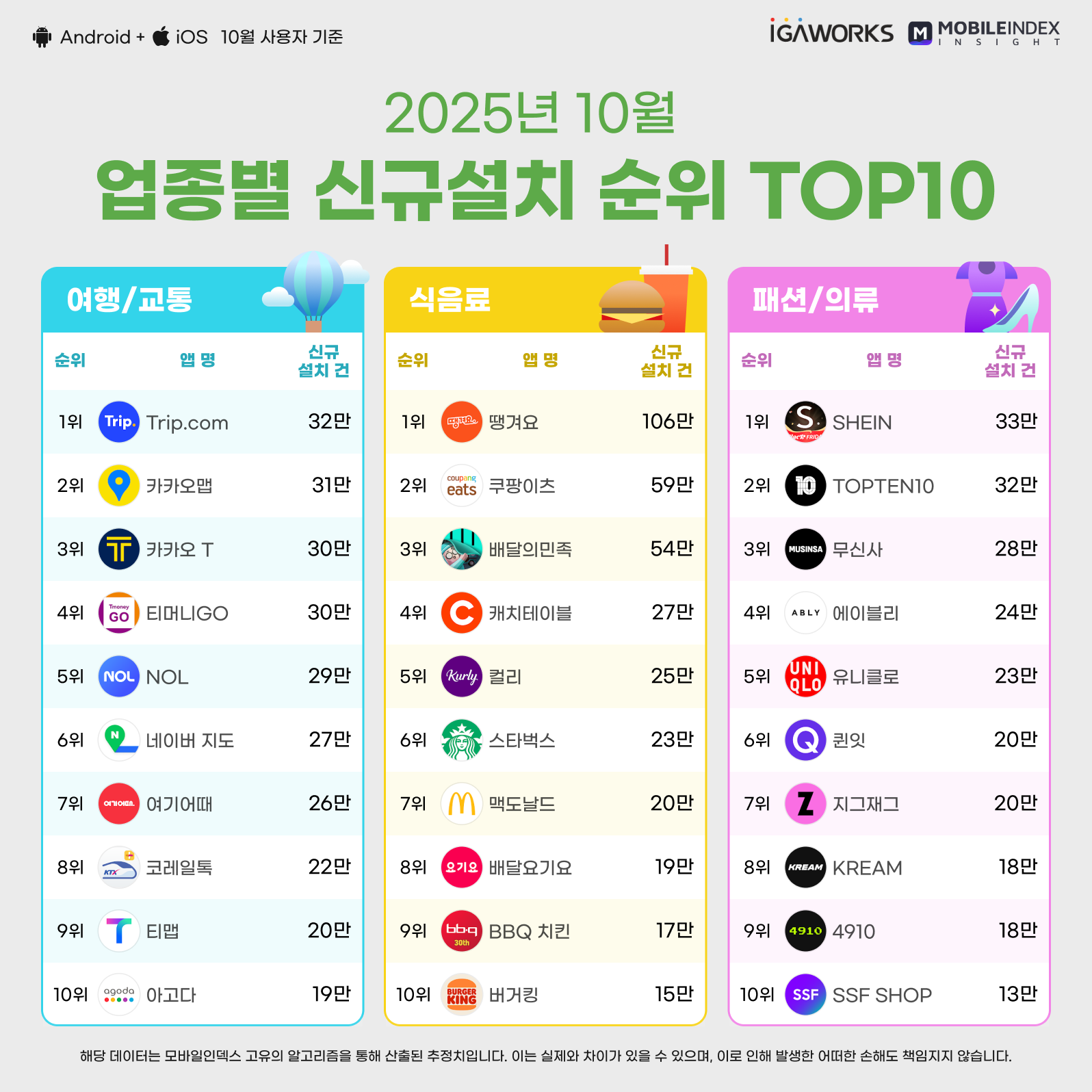 - 본 리포트에서는 모바일인덱스 INSIGHT 데이터를 기반으로, 2025년 10월 모바일 앱 사용자 수 및 신규 설치 순위를 분석합니다.