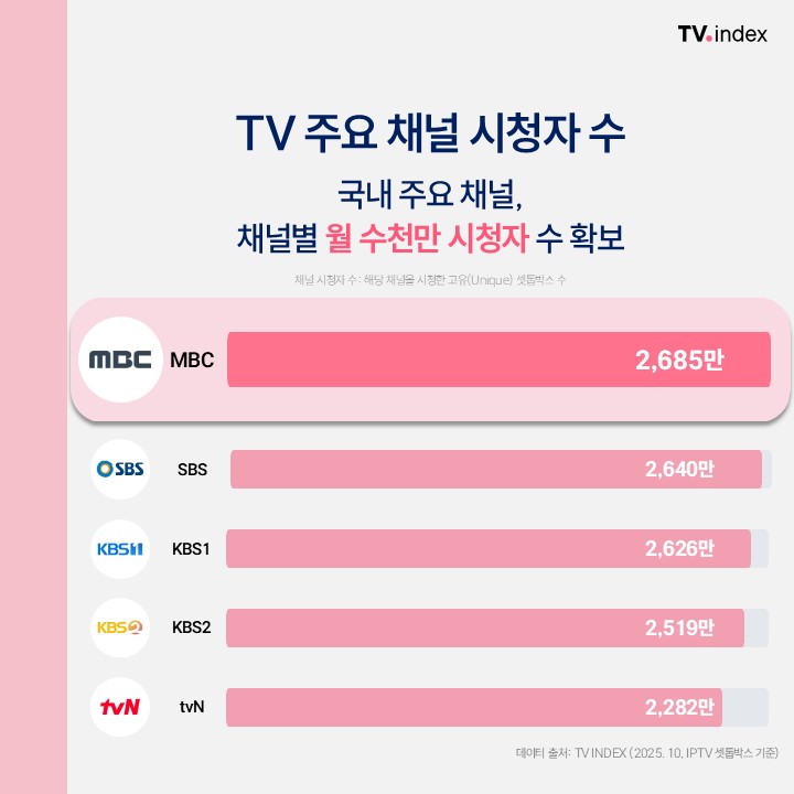 2025년 10월 기준, MBC(2,685만), SBS(2,640만), KBS1(2,626만), KBS2(2,519만), tvN(2,282만) 등 주요 방송 채널은 월 수천만 단위의 Unique 시청자 수를 기록했습니다.