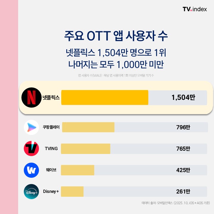 같은 기간, OTT 중 가장 큰 서비스인 넷플릭스조차 약 1,504만 명 수준에 머물렀습니다.