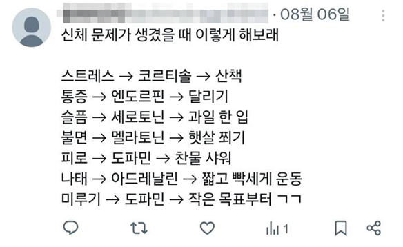AI, HSP 테스트 같은 ‘감정 객관화 도구’를 통해 감정에 대한 이해도를 높였다면, 루틴을 통해 감정을 관리하는 모습이 나타납니다. SNS에서는 감정과 호르몬을 연관지어 해결책을 제시하는 글이 주목 받기도 했어요. 스트레스를 받으면 코르티솔을 완화하기 위해 산책을 하고, 피로가 쌓이면 도파민 분비를 돕기 위해 냉수욕을 하는 식이죠.