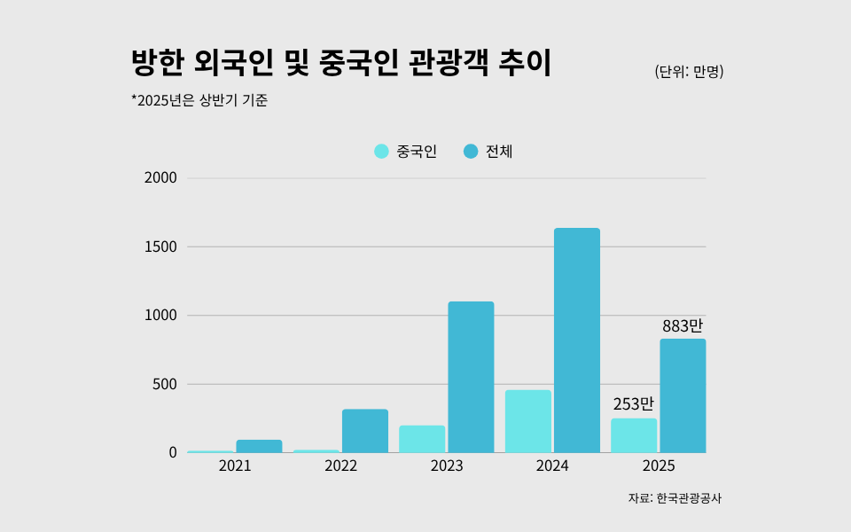 한국관광공사 자료에 따르면 올해 상반기 외국인 관광객은 883만 명으로 역대 최대치를 기록했습니다. 그중 중국인 관광객이 253만 명으로 전체 1위를 차지했어요. 정부는 이번 무비자 정책으로 관광 수요가 본격적으로 회복되면 연간 외국인 방문객 2,000만 명 돌파도 가능할 것으로 보고 있습니다. 그만큼 중국 관광객의 영향력은 큽니다. 하지만 관광객이 늘어난다고 해서 자동으로 매출이 오르진 않죠.
