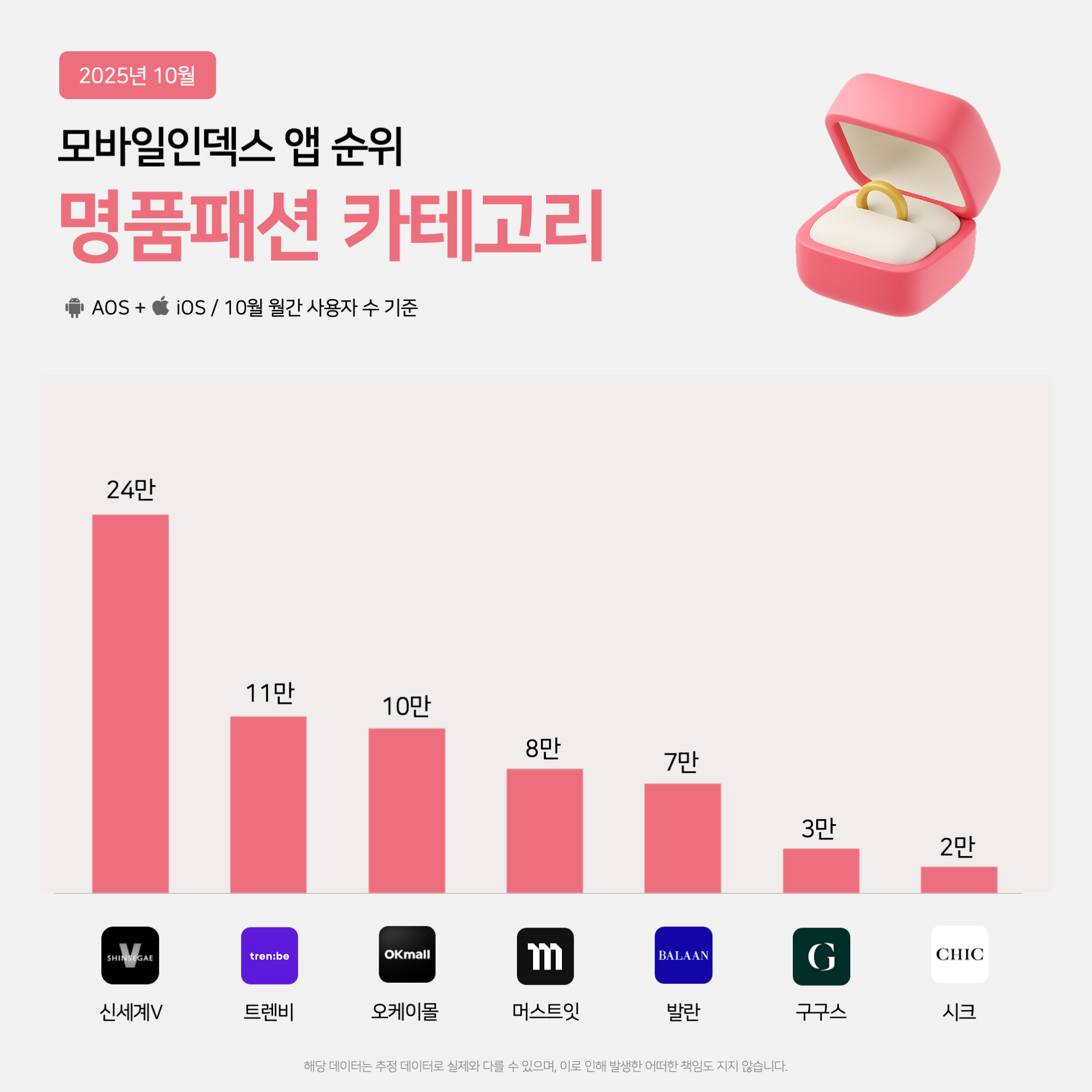 신세계V가 월간 사용자 수 24만 명으로 명품패션 앱 중 1위를 기록했습니다. 뒤이어 트렌비가 11만 명으로 2위, 오케이몰이 10만 명으로 근소한 차이의 3위를 차지했습니다.
