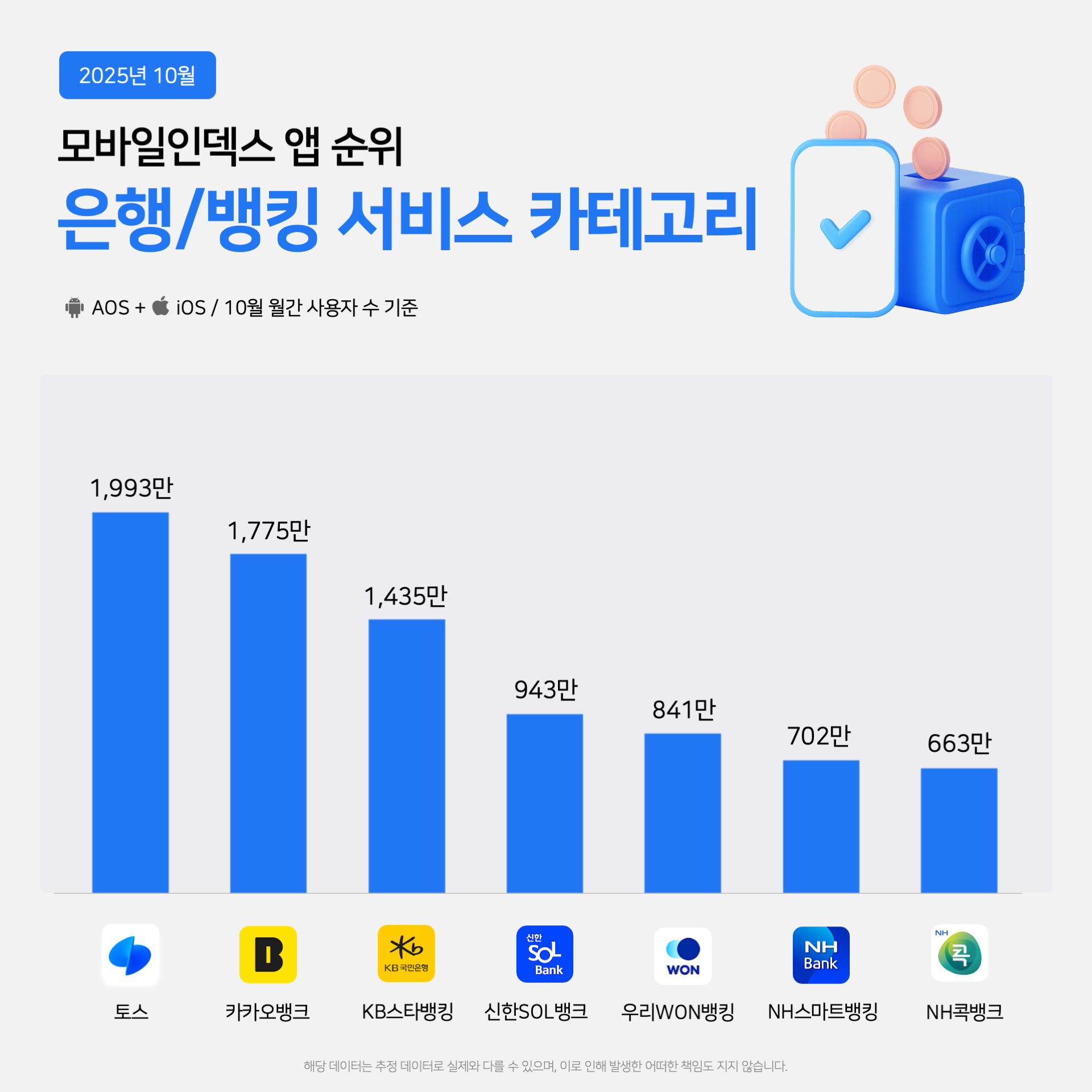 은행/뱅킹 서비스 월간 사용자 수 순위에서는 '토스'가 1,993만 명으로 1위, '카카오뱅크'가 1,775만 명으로 2위, 'KB스타뱅킹'이 1,435만 명으로 3위를 차지했습니다.