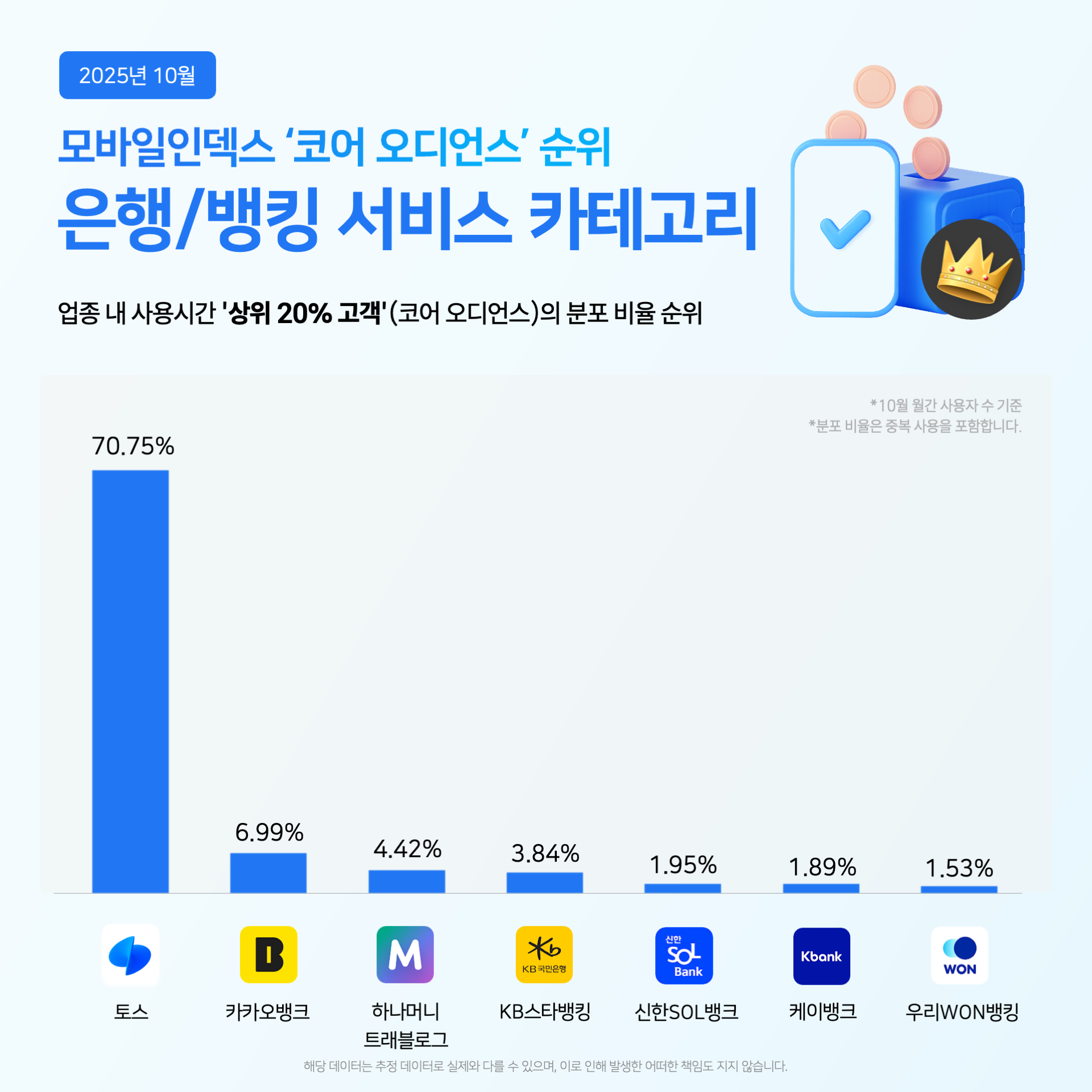 이 결과는 은행/뱅킹 서비스 내에서 전체 이용 규모와 핵심 사용자층의 집중도가 다르게 나타난다는 점을 드러내며, '토스’는 핵심 사용자층에서도 독보적인 사용 비중을 확보한 것으로 확인됩니다.
