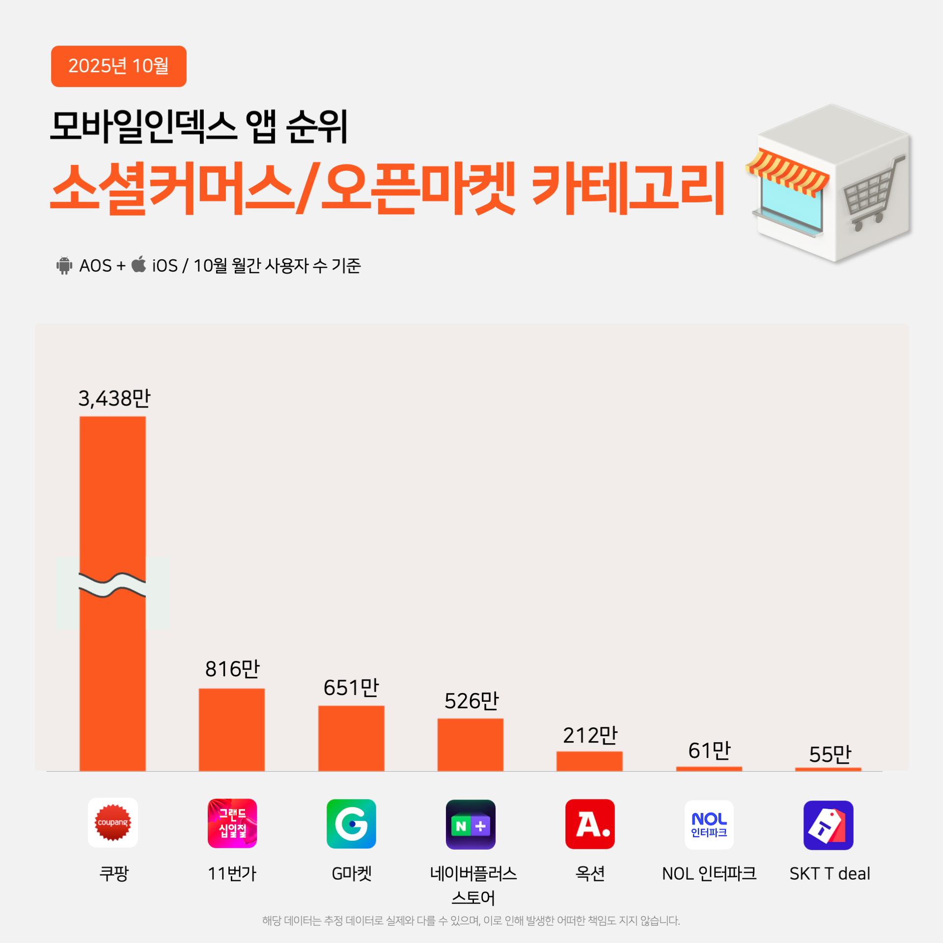 소셜커머스/오픈마켓 월간 사용자 수 순위에서는 ‘쿠팡’이 3,438만 명으로 단연 1위를 기록했습니다. 2위는 816만 명의 ‘11번가’, 3위는 651만 명의 ‘G마켓’이 차지했습니다.
