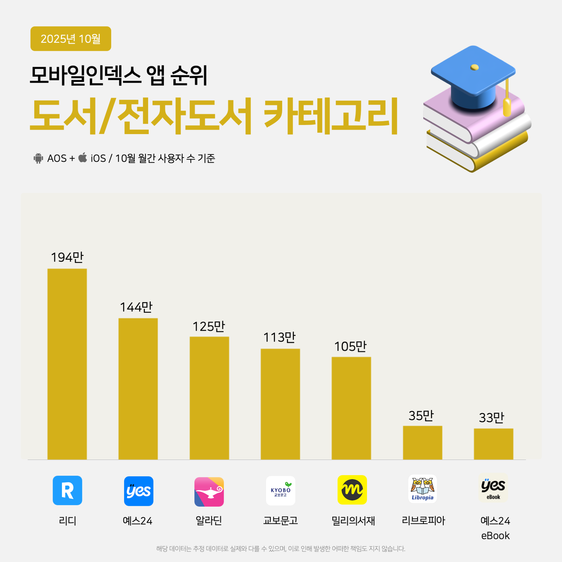 도서/전자도서 월간 사용자 수 순위에서는 '리디'가 이 811만 명으로 1위를 차지하였습니다. 2위는 144만 명을 기록한 '예스24', 3위는 125만 명의 '밀리의 서재'입니다.