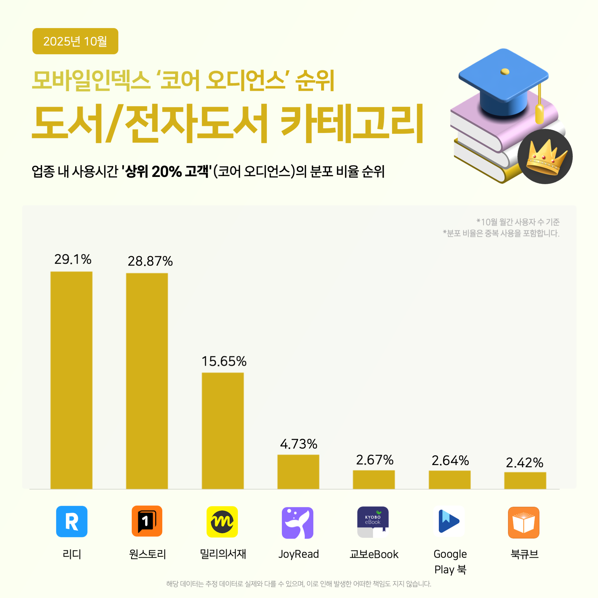 ‘코어 오디언스 순위’에서도 ‘리디’가 29.1%로 1위를 차지했지만, 28.87%로 2위를 기록한 ‘원스토리’가 나란히 높은 비중을 보이며 전체 사용자 기준과는 전혀 다른 상위권 구도가 형성되었습니다.