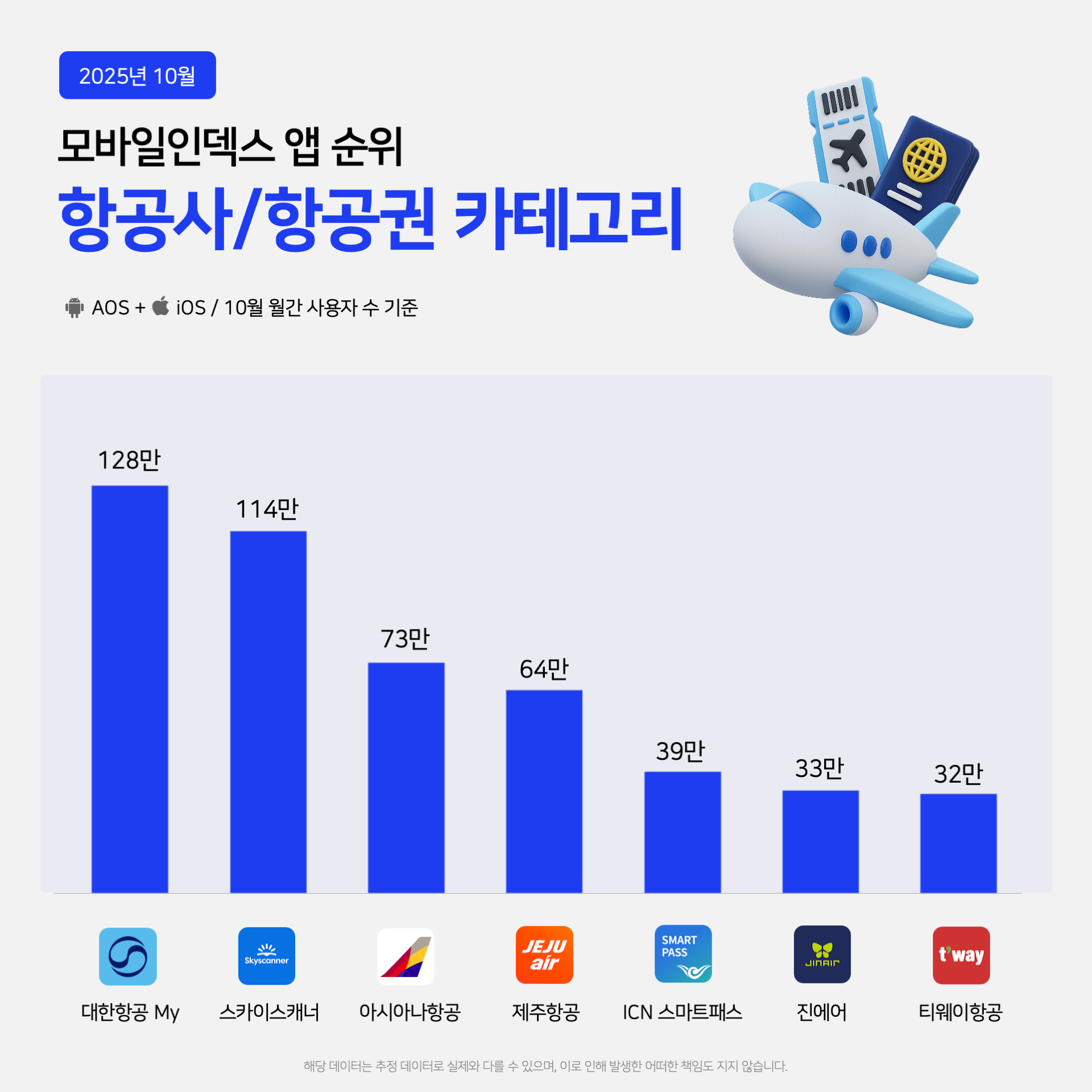 항공사/항공권 월간 사용자 수 순위에서는 ‘대한항공 My’가 128만 명으로 1위, 2위는 114만 명의 ‘스카이스캐너’, 3위는 73만 명의 ‘아시아나항공’이 그 뒤를 이었습니다.