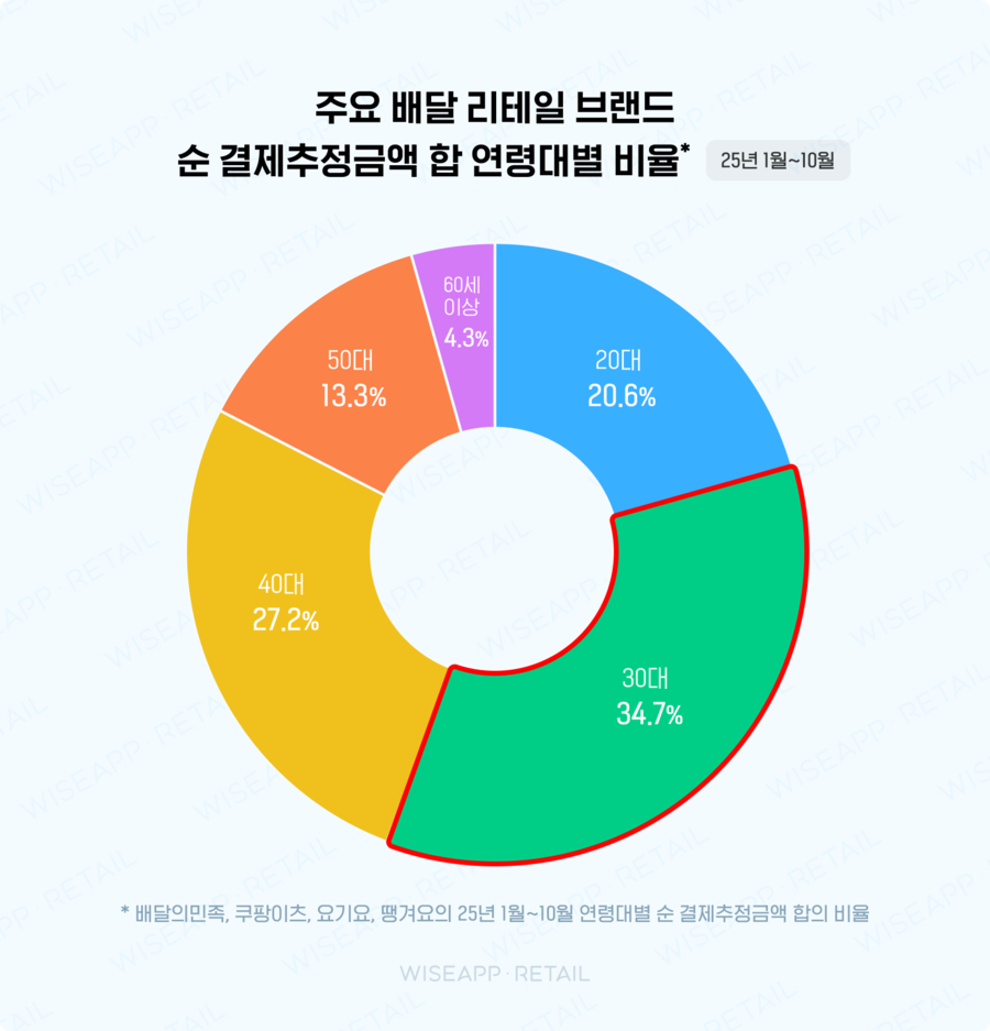 2025년 1월부터 10월까지, 주요 배달 앱 브랜드에서 가장 많이 결제한 연령대는 30대로, 배달 앱 결제추정금액 합산의 34.7%를 차지한 것으로 나타났어요. 그 뒤를 이어 40대(27%), 20대(21%), 50대(13%), 60세 이상(4%) 순이었어요.