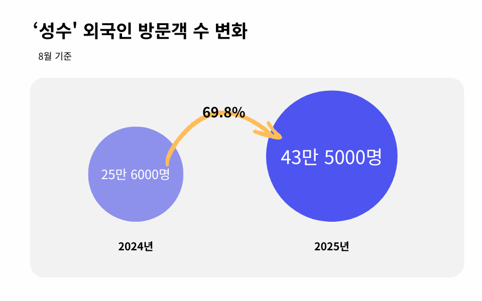 성수는 이미 한국인에게는 익숙한 핫플이지만, 2025년 들어 외국인 사이에서도 폭발적으로 성장한 관광지 1순위가 됩니다. 무려 1년 동안 69.8%나 방문객이 늘어난 것이죠. 성수가 명동이나 홍대, 강남을 제치고 외국인들에게도 핵심 명소가 된 이유는 다음 네 가지입니다.