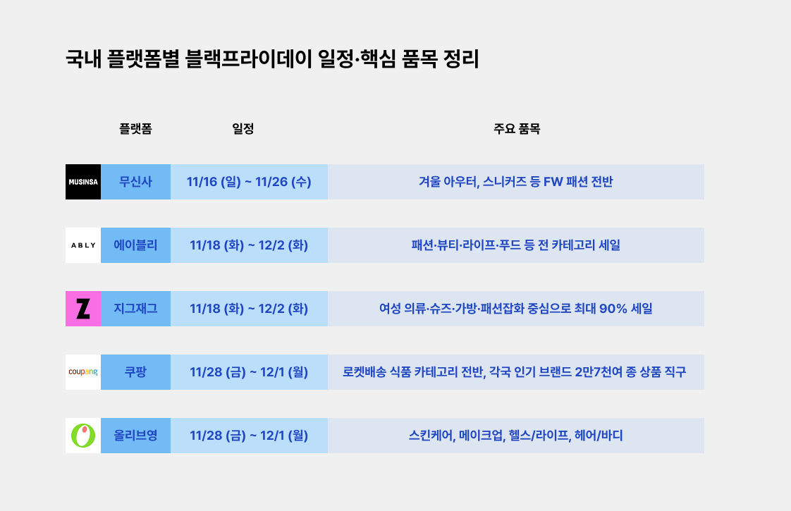 한국에서는 블프를 ‘직구 최대 시즌’으로 인식하기 때문에, 실제 결제량은 광군제보다 블프에 집중되는 경향이 강해요. 이런 구조 때문에 플랫폼들도 블프에 더 많은 에너지를 쏟는 모습이에요.