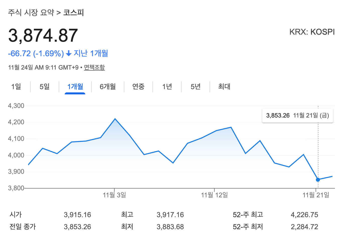11월 21일 코스피는 하루 만에 3.79% 하락하며 3853.26에 마감했고, 장중엔 3838선까지 밀렸어요. 코스피가 3800대를 기록한 건 한 달 만인데, 급락의 핵심은 미국발 ‘AI 버블론’이 다시 확산됐다는 점이에요. 엔비디아가 급등 후 단숨에 3% 넘게 빠지며 투자 심리가 얼어붙었고, AMD·마이크론 등 주요 반도체주가 동반 급락하자 국내 시장도 그대로 흔들린 흐름이에요.