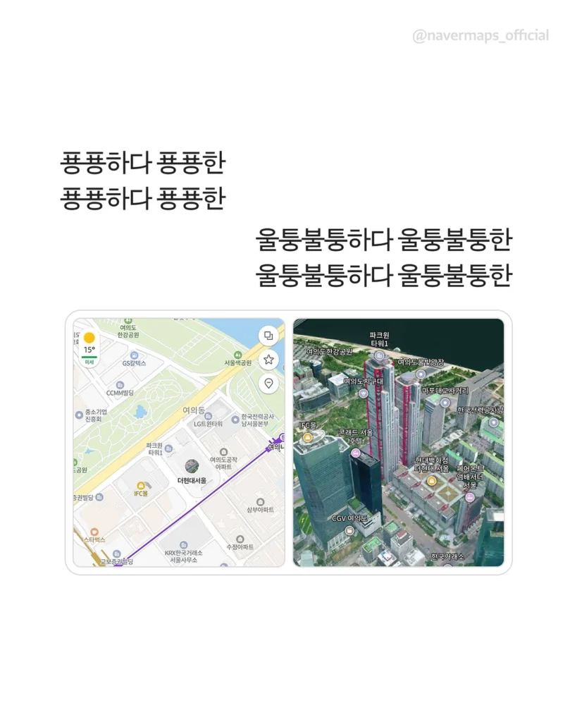 플라잉뷰 기능 홍보 사례: 유행하는 '카니의 울퉁불퉁하다 밈'을 네이버지도의 일반지도와 플라잉뷰3D의 시각적 차이에 적용하여, 기술적인 기능도 유머러스하게 전달했습니다.
