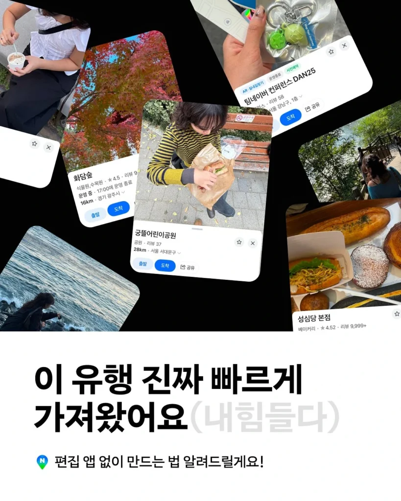유머러스한 밈이나 유행하는 음원, 챌린지를 단순하게 따라 하는 것을 넘어, 네이버지도의 맥락에 맞춰 빠르게 재가공합니다. 특히 구글맵 템플릿이 바이럴 되자마자 네이버지도 버전의 템플릿을 빠르게 제작해 배포하며, 유저들이 다른 앱 대신 네이버지도를 통해 '힙한 트렌드'에 동참하게 만들었습니다.