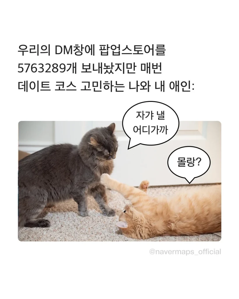 팝업스토어 검색 기능을 홍보할 때에는, 데이트할 때 커플 간의 공감 요소를 귀여운 고양이 짤로 후킹한 뒤 기능 사용의 필요성을 자연스럽게 전달했습니다.