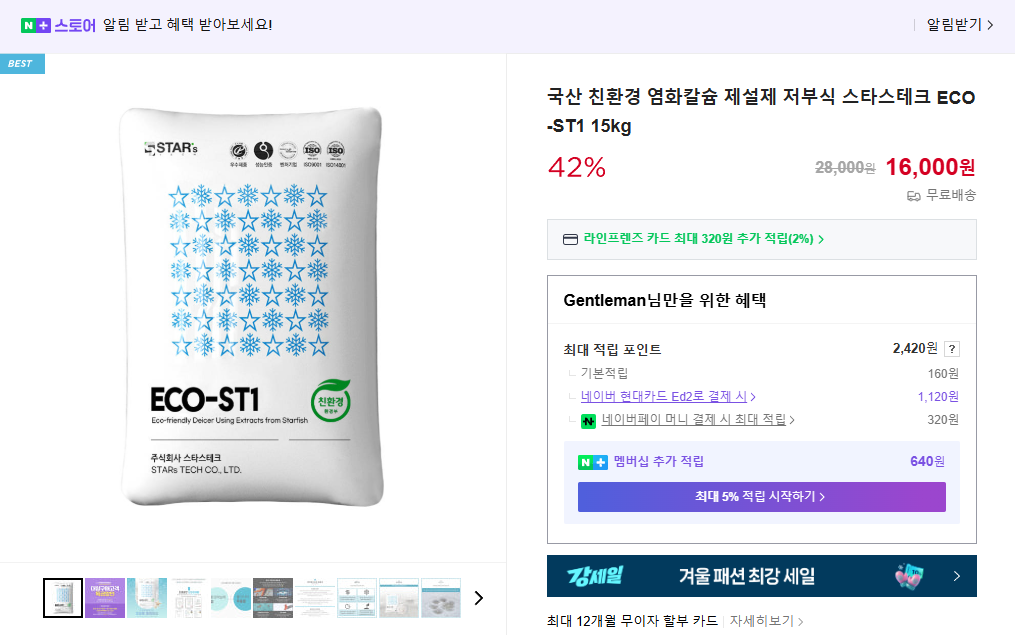 여기서 스타스테크는 바다의 골칫덩이였던 불가사리를 활용해 친환경 제설제를 만들었어. 그래서 나온 게 친환경 제설제 “ECO-ST”라는 제품이야. 가격은 기존 친환경 제설제와 비슷하면서도 철 부식이나 도로 손상, 토양 오염 같은 문제를 더 적게 만드는 성능을 보여준다는 점이 특징이지.