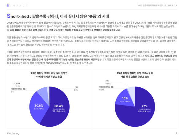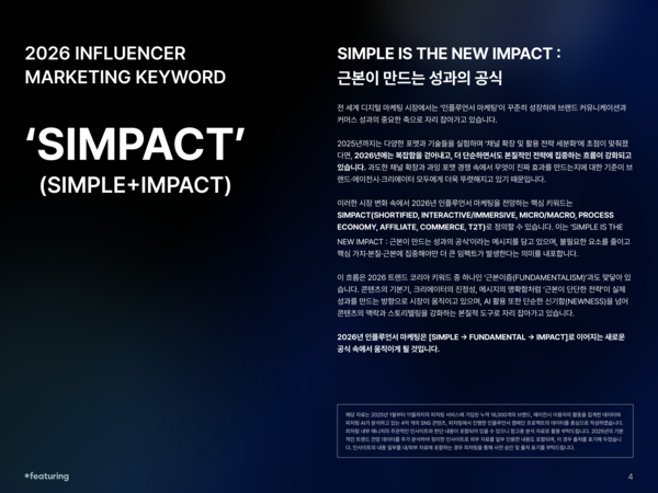 - 16,000개 브랜드·4억 개 콘텐츠 데이터를 기반으로, 내년 인플루언서 마케팅의 새로운 기준을 제시하는 트렌드 리포트 2026 인플루언서 마케팅을 관통하는 핵심 공식 : S.I.M.P.A.C.T를 소개합니다!