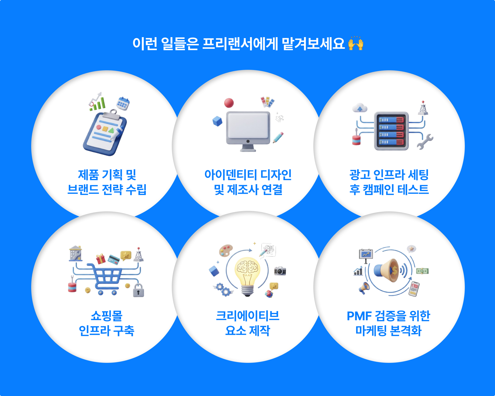 정규직 채용은 부담스럽고, 대행사는 비용이 만만치 않죠. 그렇다고 혼자 모든 걸 감당하기엔 시간도 전문성도 부족해요. 이럴 땐 필요한 전문가를 필요한 만큼만 유연하게 활용하는 게 답입니다.